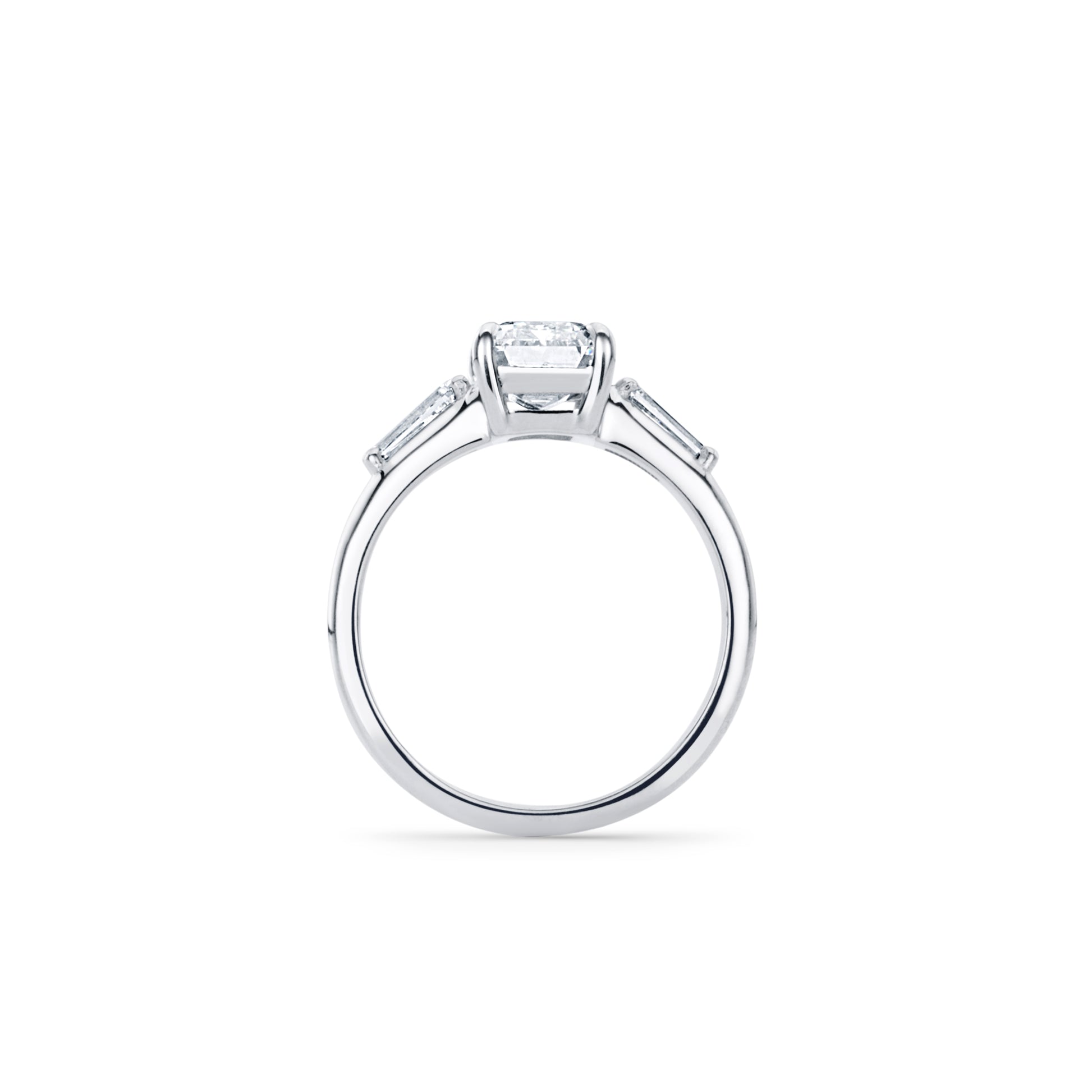 The clean lines of the emerald cut combined with the sleek baguette side stones create a sophisticated, classic look with exceptional brilliance.
