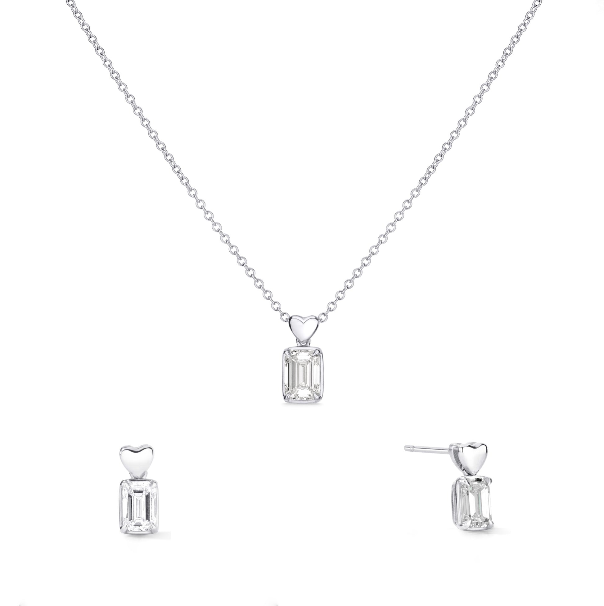 This refined jewellery set is crafted in luxurious 18k white gold and showcases the clean lines of emerald-cut diamonds, beautifully softened by delicate heart details. The necklace features a striking emerald-cut diamond suspended from a fine trace chain, while the matching stud earrings mirror the design with perfectly balanced proportions.