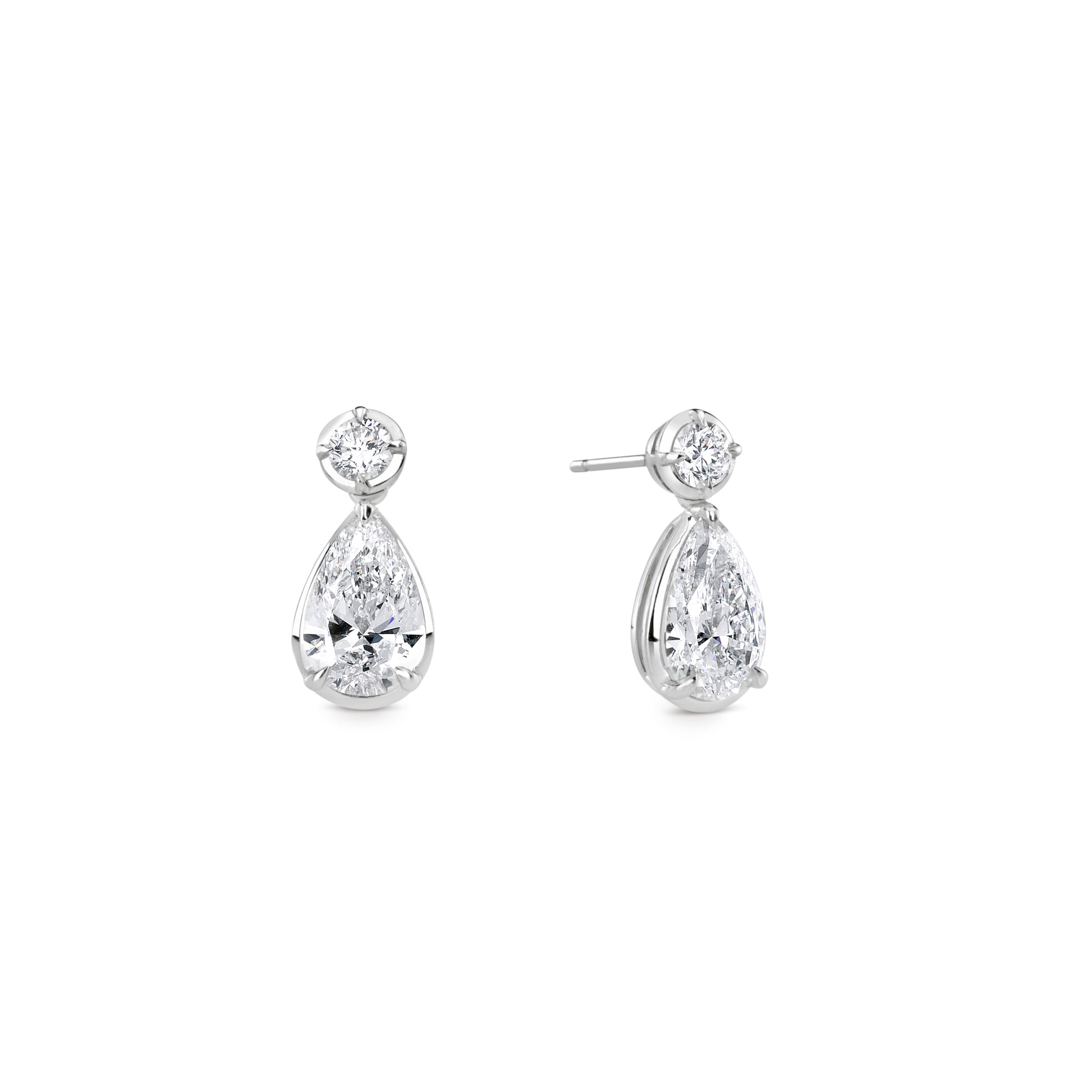 The earrings have a total diamond weight of 4.4 carats, offering exceptional brilliance and eye-catching movement. The pendant features a stunning pear-shaped diamond with a total weight of 3.2 carats, delicately suspended from a fine chain for a refined and graceful look.